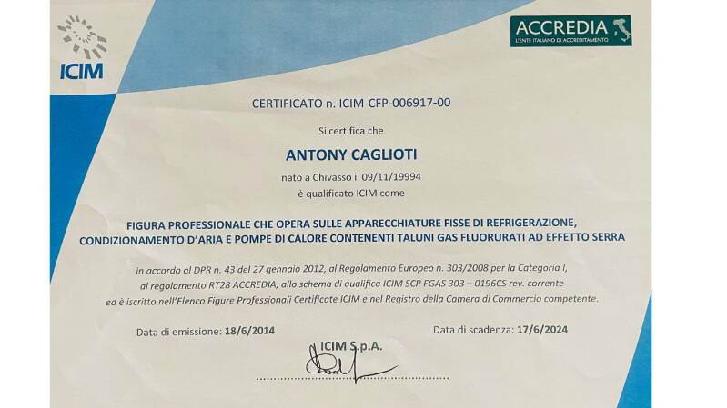 • CERTIFICAZIONE APAVE (installazione, riparazione, manutenzione o assistenza, smantellamento di apparecchiature fisse di refrigerazione e condizionamento d'aria e pompe di calore fisse con dimensione massima del carico senza limiti di kg)